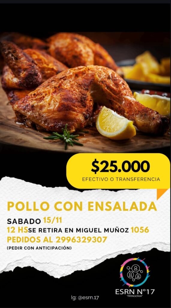 La modalidad Informática de la ESRN N°17 organiza una venta anticipada de pollos a la parrilla con ensalada, con el objetivo de recaudar fondos destinados a la compra de material didáctico para las actividades del área.