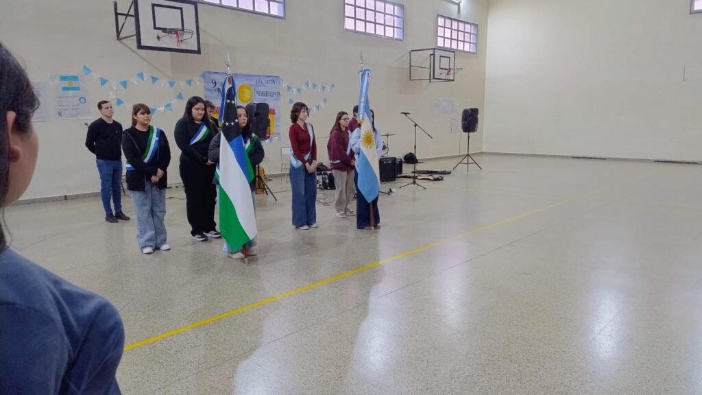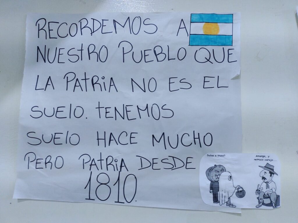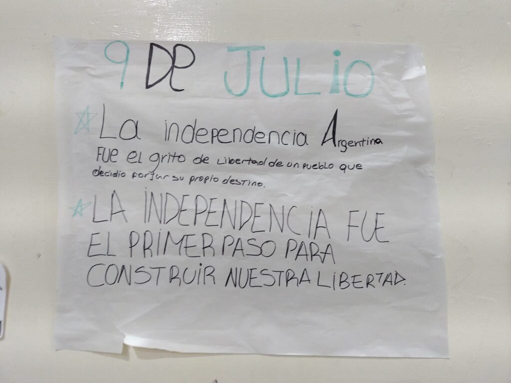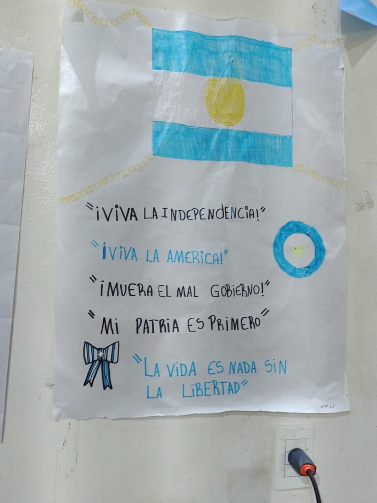 La jornada comenzó con una clase especial en cada turno, donde se trabajó a partir de dos frases que invitaban a pensar qué significa hoy ser un pueblo libre e independiente. Luego de esa instancia de reflexión, los estudiantes pegaron sus producciones en el SUM, compartiendo con la comunidad sus miradas y sentires. A continuación, dio inicio el acto formal.