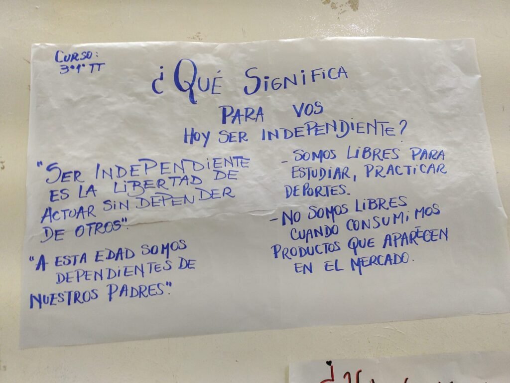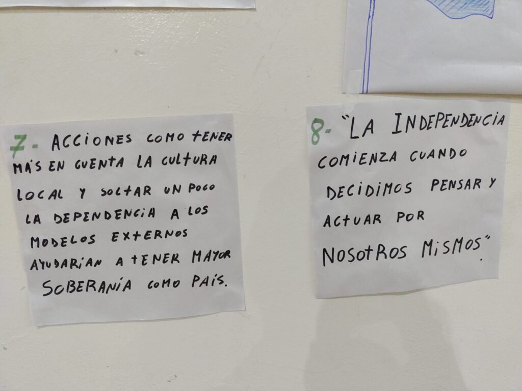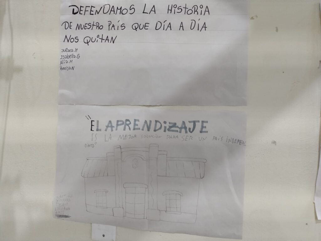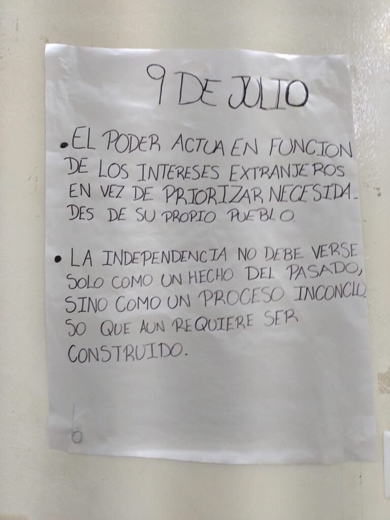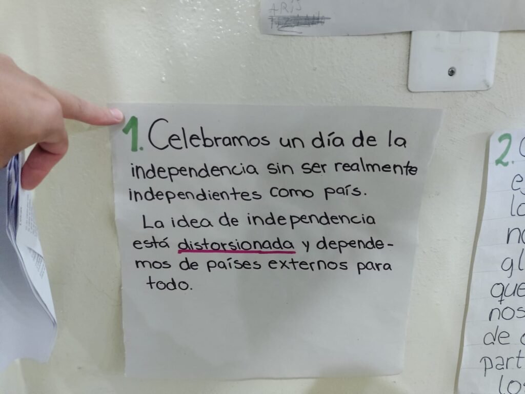 Las producciones elaboradas por los estudiantes durante la clase reflexiva fueron una muestra contundente del nivel de pensamiento y compromiso que se generó. Frases como “la independencia comienza cuando decidimos pensar y actuar por nosotros mismos” o “celebramos un día de la independencia sin ser realmente independientes como país” expresan una lectura lúcida y valiente sobre la realidad. Otros afiches abordaron temas como la dependencia tecnológica, la deuda externa, la pérdida de soberanía cultural y la importancia del aprendizaje como base de una independencia auténtica. Estas reflexiones quedaron expuestas en el SUM antes del inicio del acto, y funcionaron como disparador colectivo y como muestra del sentido profundo que se quiso dar a la jornada.