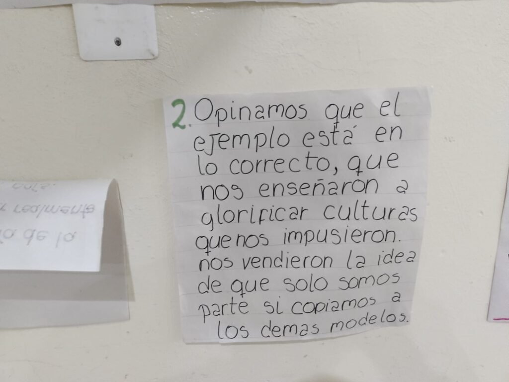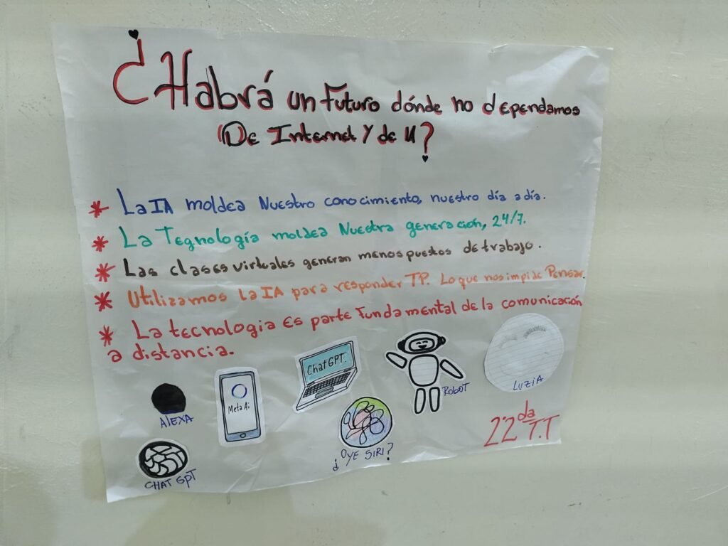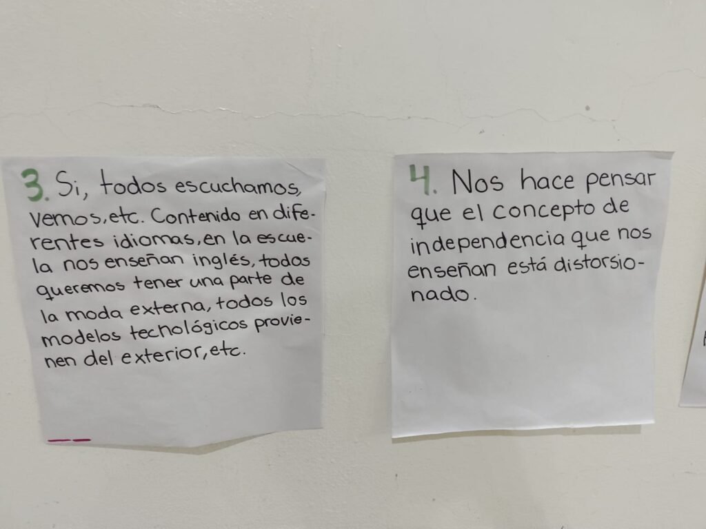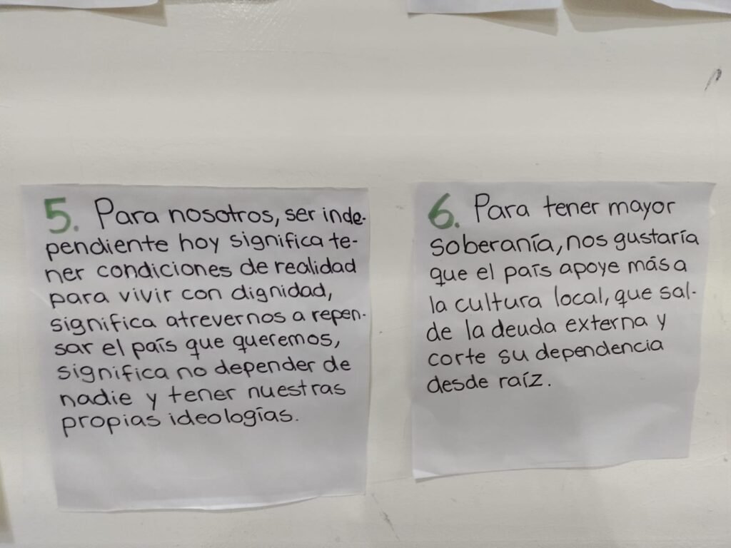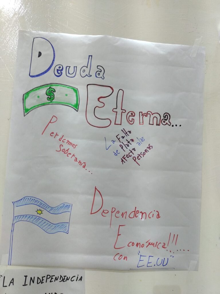 Las producciones elaboradas por los estudiantes durante la clase reflexiva fueron una muestra contundente del nivel de pensamiento y compromiso que se generó. Frases como “la independencia comienza cuando decidimos pensar y actuar por nosotros mismos” o “celebramos un día de la independencia sin ser realmente independientes como país” expresan una lectura lúcida y valiente sobre la realidad. Otros afiches abordaron temas como la dependencia tecnológica, la deuda externa, la pérdida de soberanía cultural y la importancia del aprendizaje como base de una independencia auténtica. Estas reflexiones quedaron expuestas en el SUM antes del inicio del acto, y funcionaron como disparador colectivo y como muestra del sentido profundo que se quiso dar a la jornada.