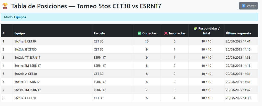 La actividad tuvo un condimento especial: se utilizó por primera vez en este tipo de instancias el sistema de gestión de torneos desarrollado por el profesor Federico Ceccotti, que permitió organizar la participación, registrar las respuestas y generar las tablas de posiciones en tiempo real. Esta herramienta, creada especialmente para este proyecto, aporta dinamismo, transparencia y modernidad a la propuesta, marcando un paso importante en la integración de la tecnología al servicio de la enseñanza.