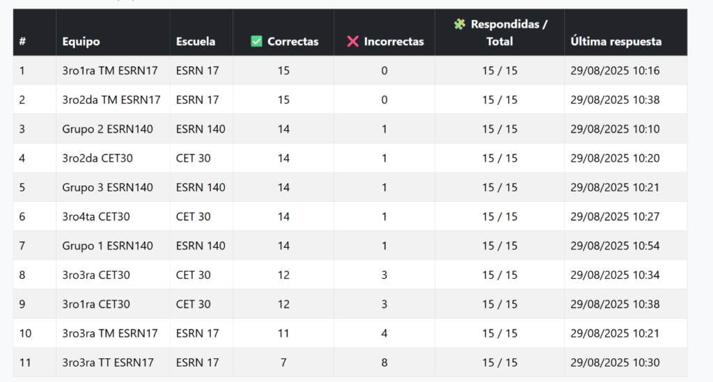 Agradecemos a docentes y equipos directivos, y especialmente a las y los estudiantes de ESRN 17, CET 30 y ESRN 140 por su participación. La tabla de posiciones final quedó disponible en la sala y en nuestros canales internos. ¡Seguimos con nuevas fechas y más desafíos!